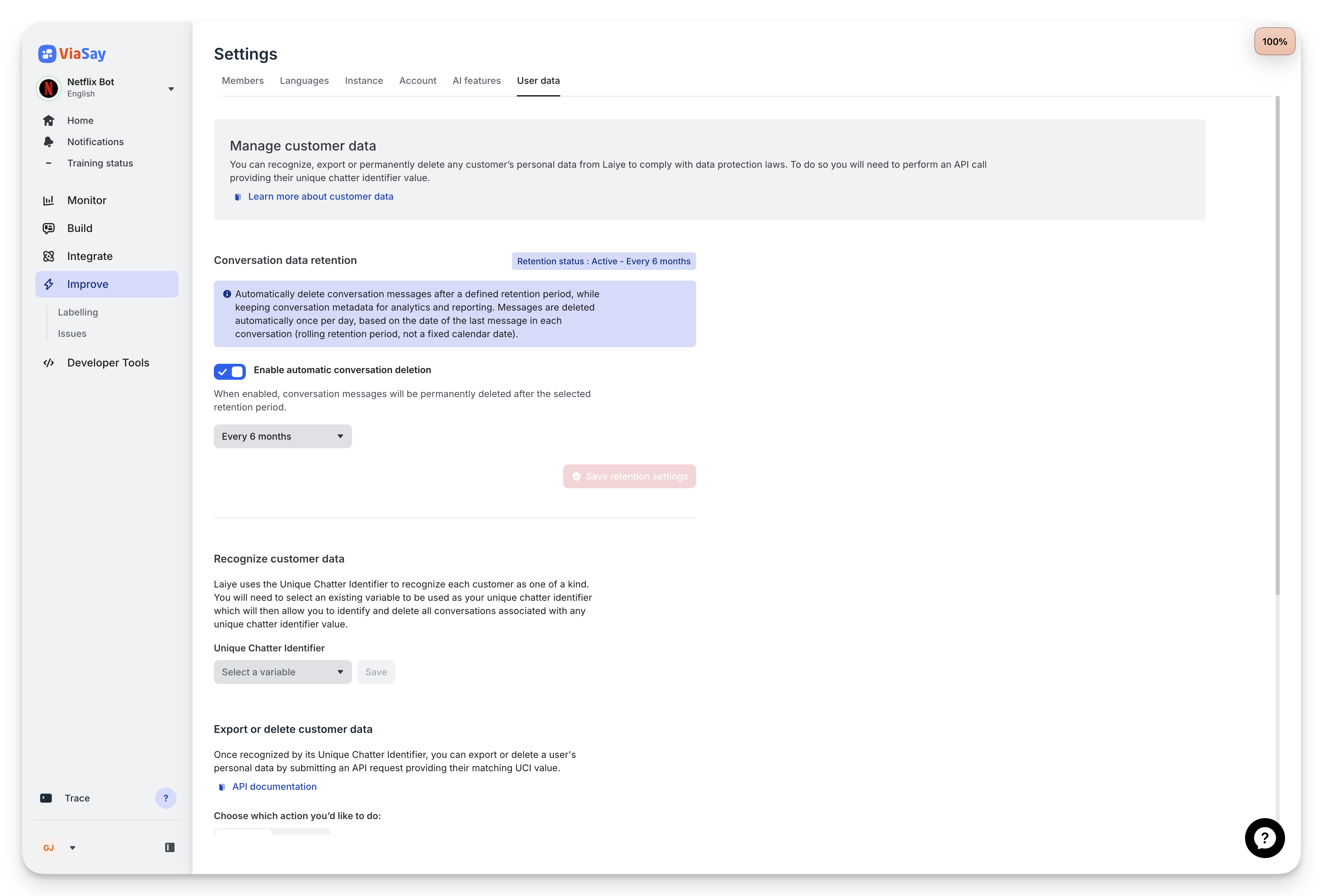Keep your data compliant, automatically. ViaSay now supports automatic conversation data retention, designed for enterprise clients with strict data protection requirements.
