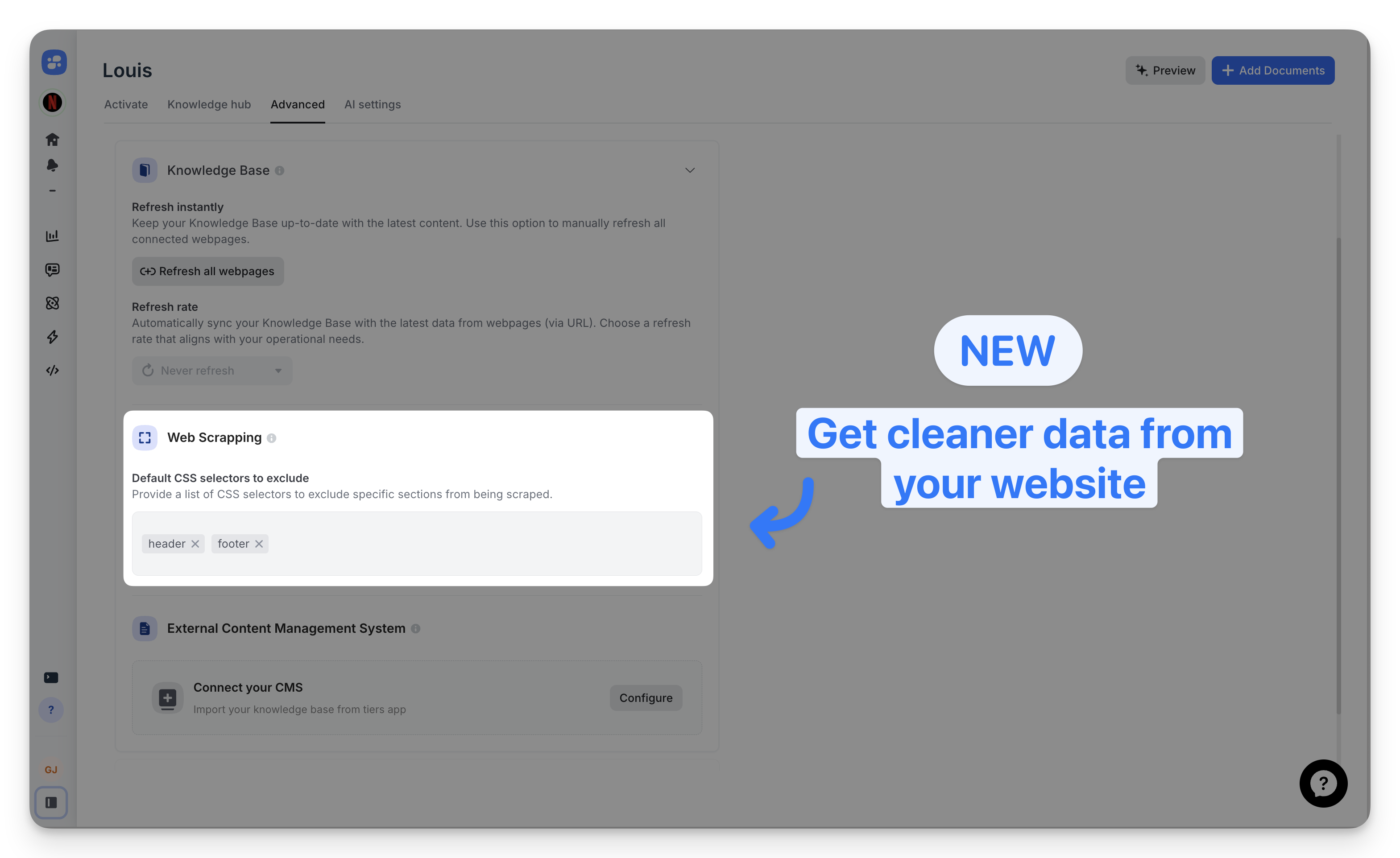 Scraped pages include headers, footers, and ads that degrade AI response quality. This update lets you exclude unwanted HTML elements globally while customizing exceptions for specific URLs