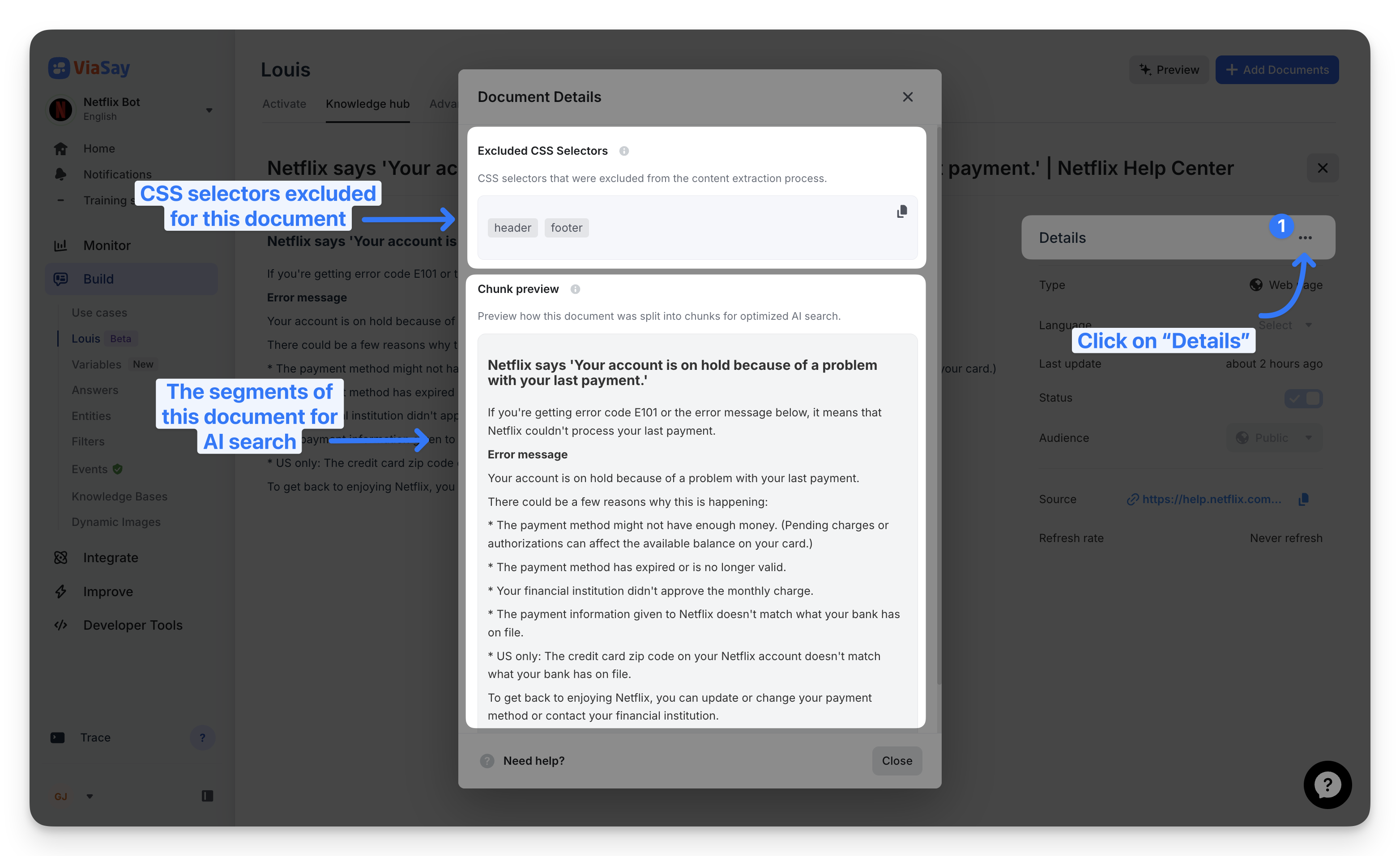 Access detailed information about any document through the Knowledge hub. The Document Details modal shows which CSS selectors were excluded and provides a chunk preview to validate content segmentation quality.
