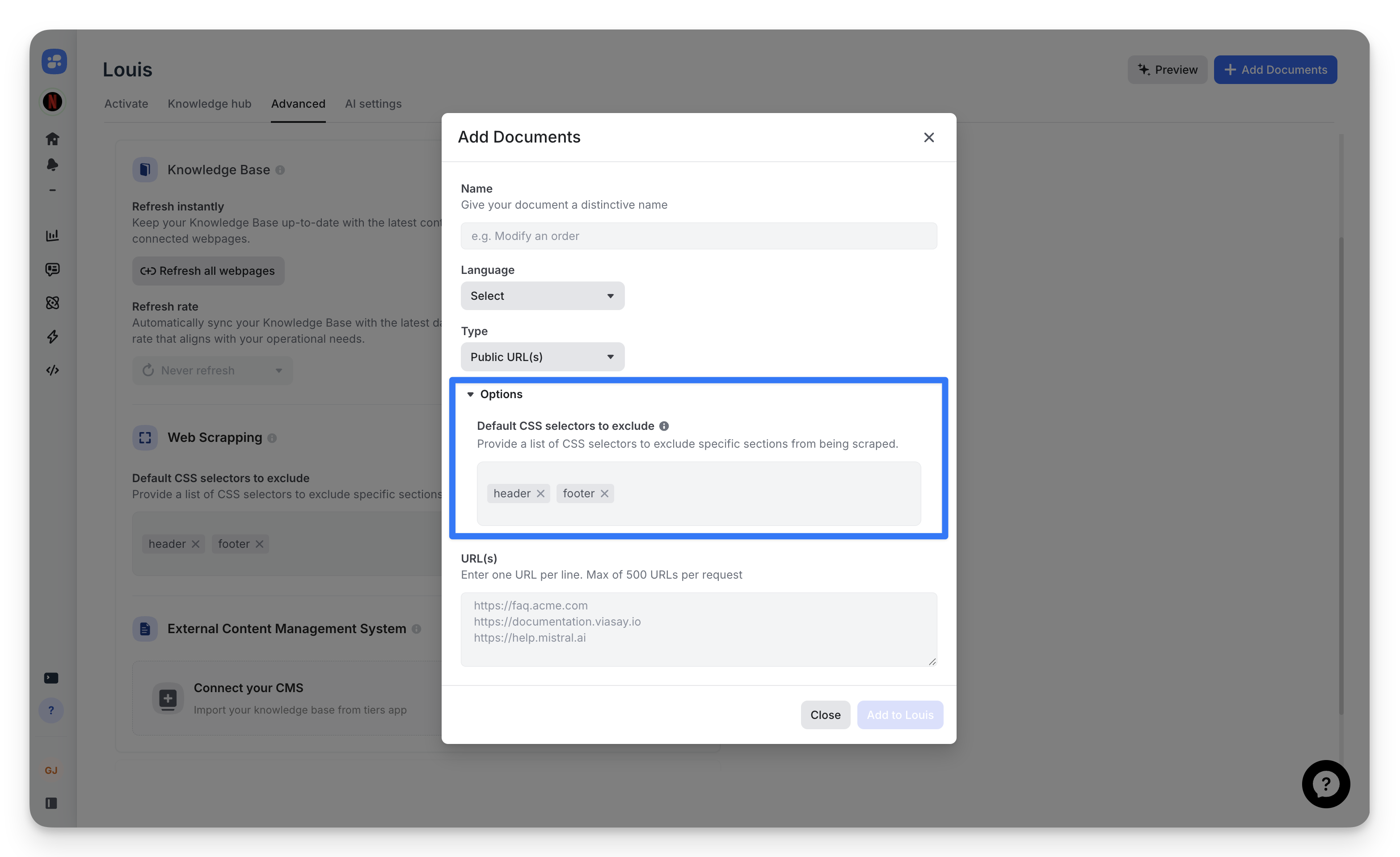 Override default exclusions when importing individual URLs. Expand the Options section in the Add Documents modal to customize selectors for specific pages without changing global defaults.