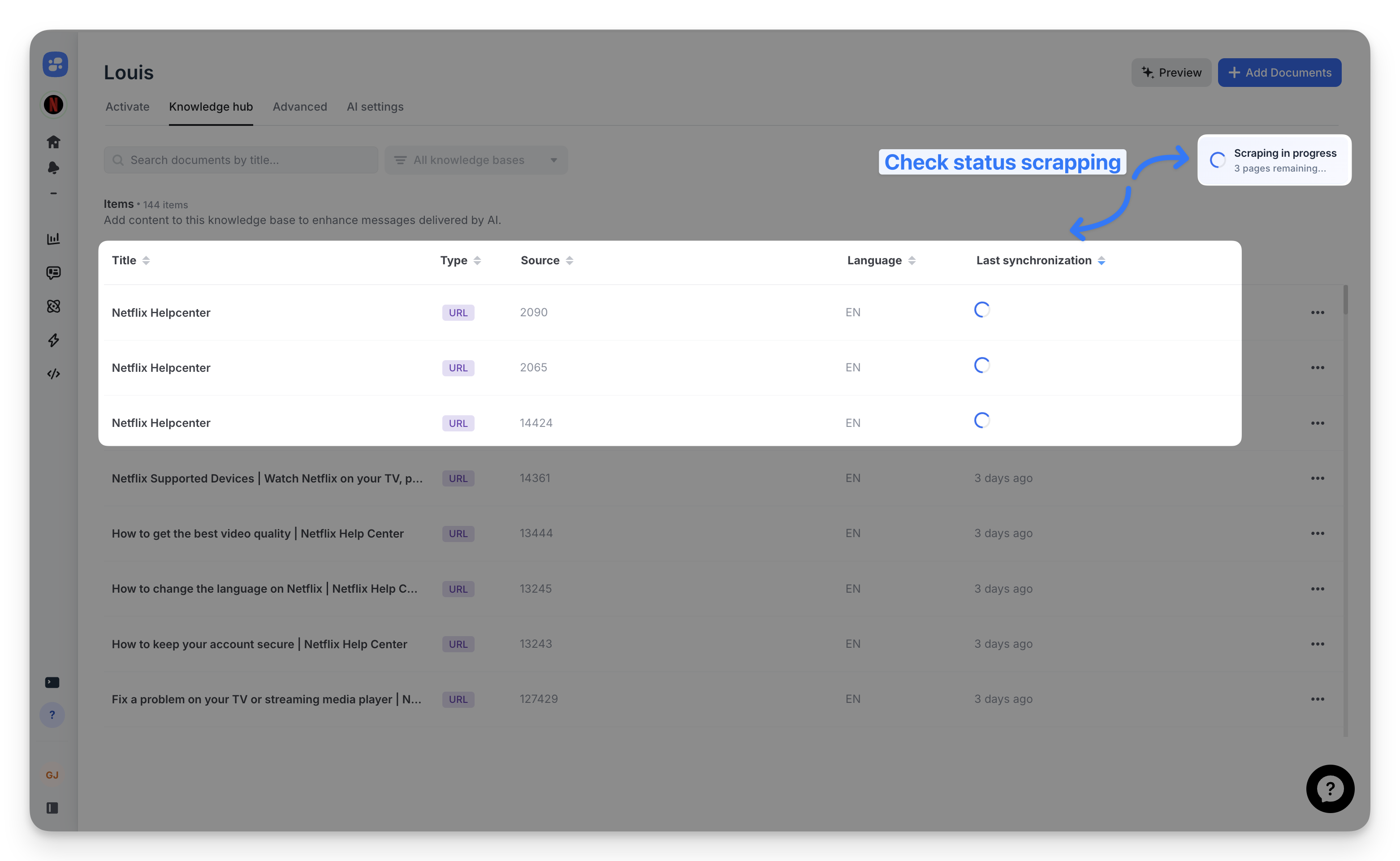 Track import progress directly in the Knowledge hub. Active scrapes display a spinner icon with a tooltip showing remaining pages