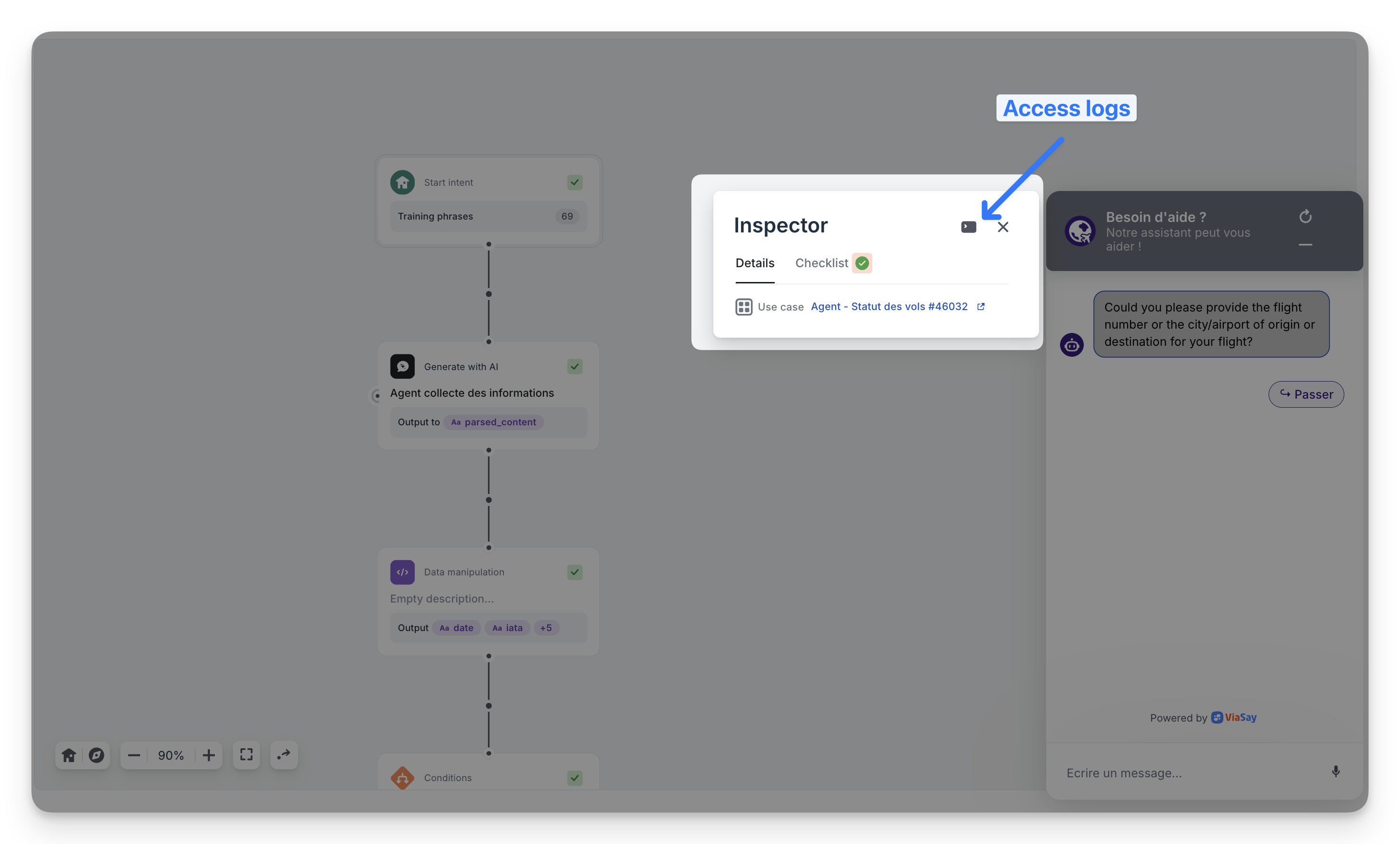- In the Flow Builder, click Test → open the Inspector → Access logs