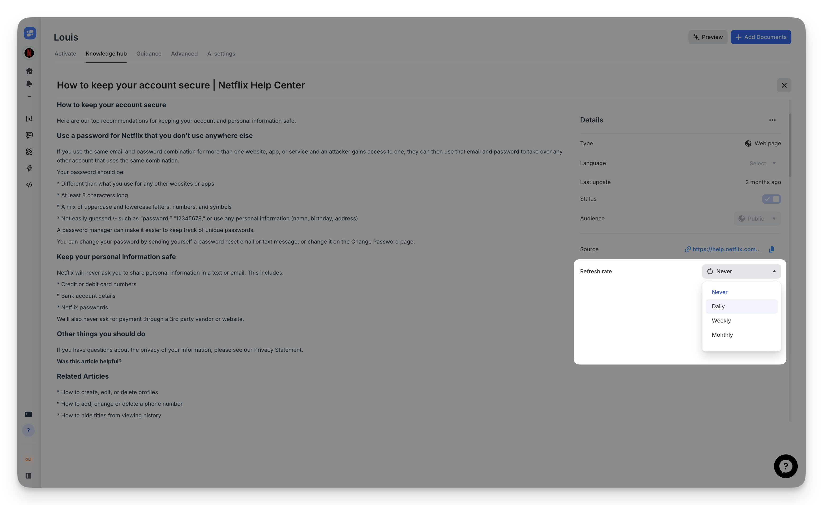When enabled, Louis will re-fetch the source automatically to keep answers aligned with the latest version of your content (help center pages, web pages, etc.).