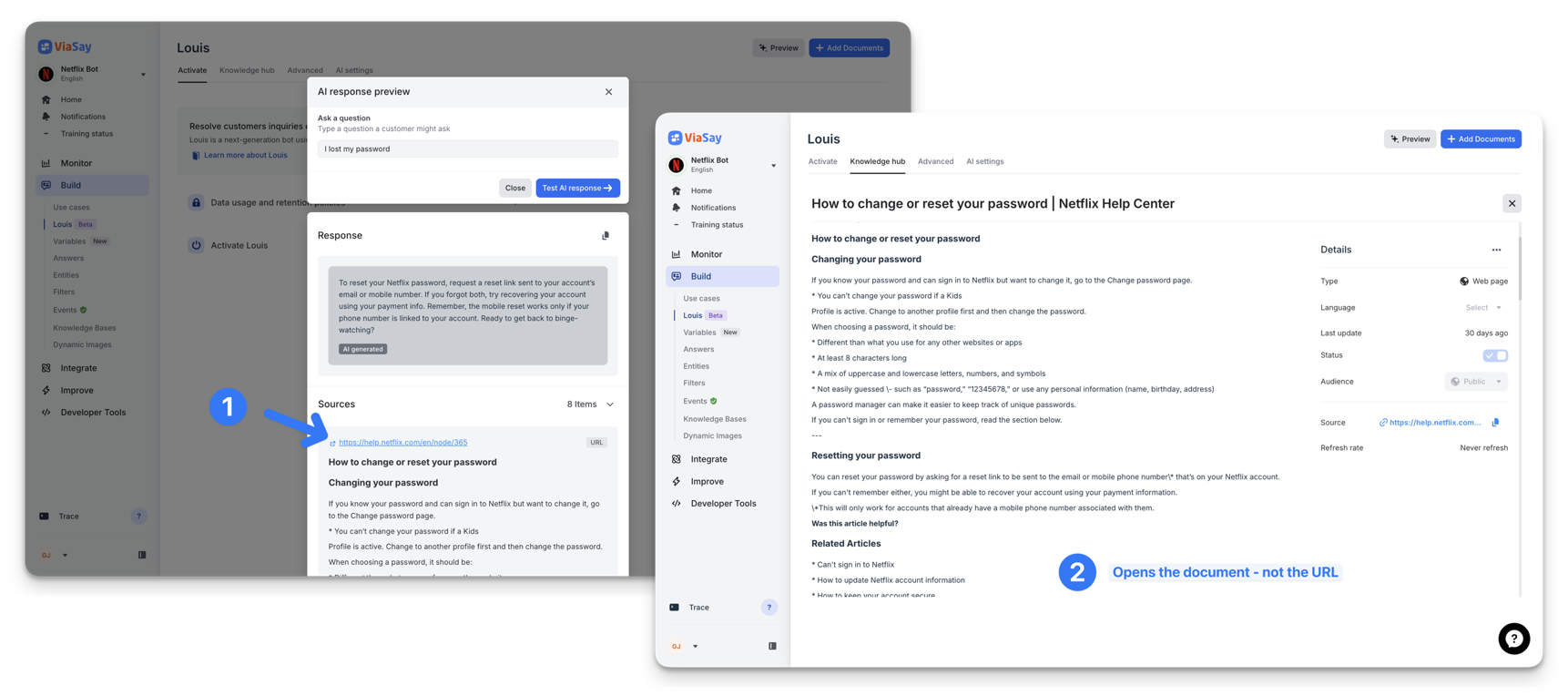 The document preview feature now opens the actual document content instead of navigating to the external URL. When users click on a document source from the knowledge base, they can now view the full document content directly within the ViaSay interface. This improvement provides a seamless reading experience without leaving the platform or opening external browser tabs.