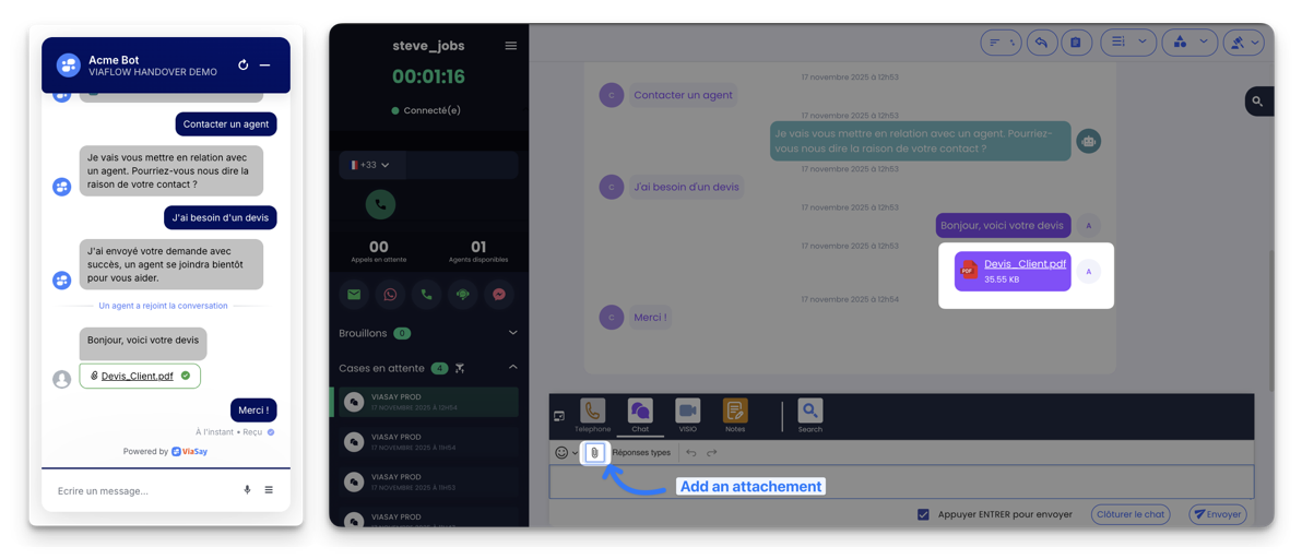 Agents can now send files to users directly from the ViaFlow Handover livechat interface, enabling seamless document sharing during conversations.