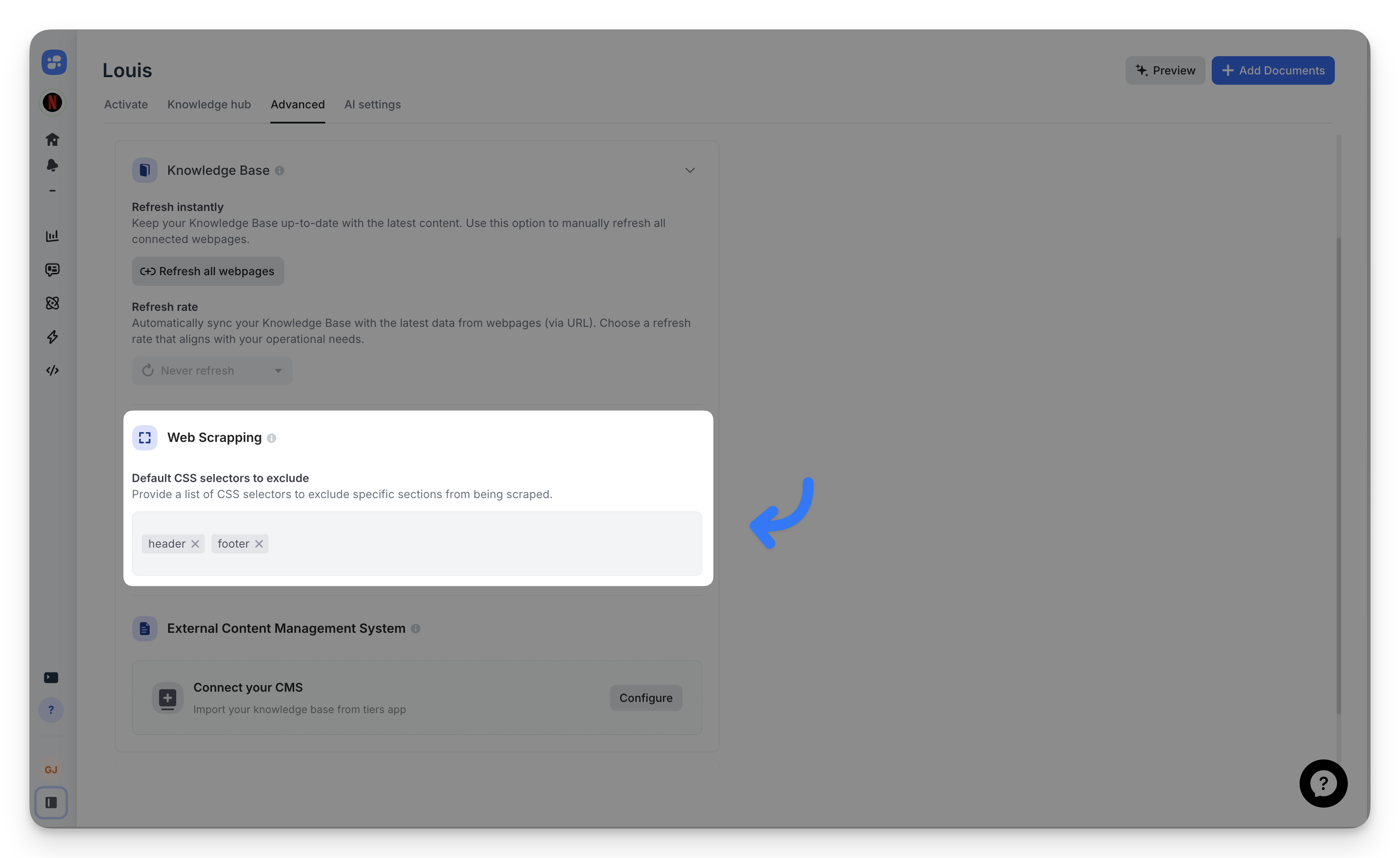 Remove unwanted HTML elements from scraped pages to improve AI response quality. Headers, footers, navigation, and ads don't belong in your knowledge base.