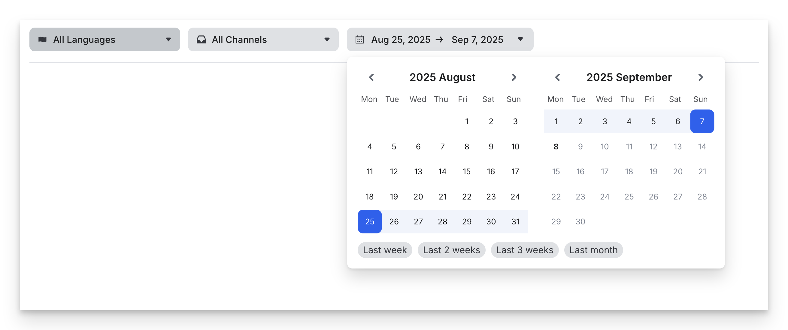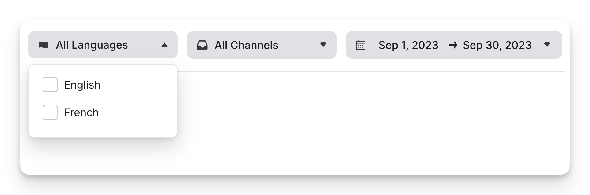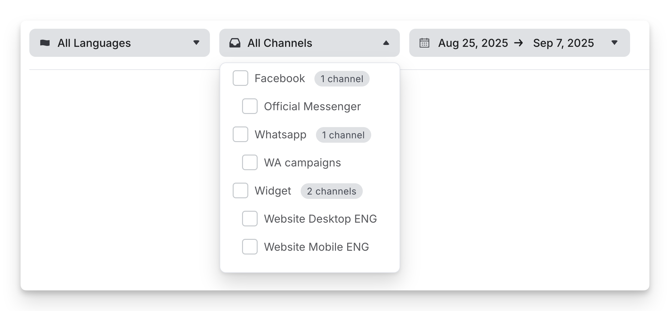 - Channel – Filter by platform (e.g., Widget, WhatsApp, Messenger).