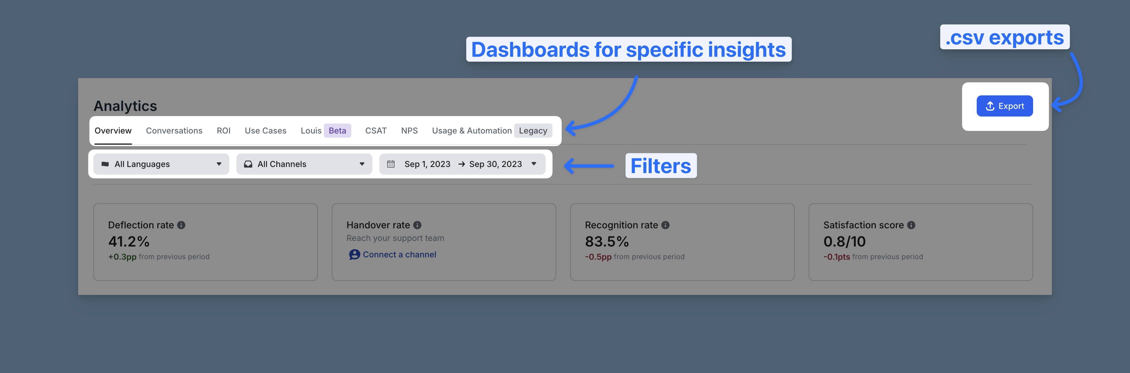- Overview – High-level performance metrics like deflection, handover, recognition, and CSAT rates.