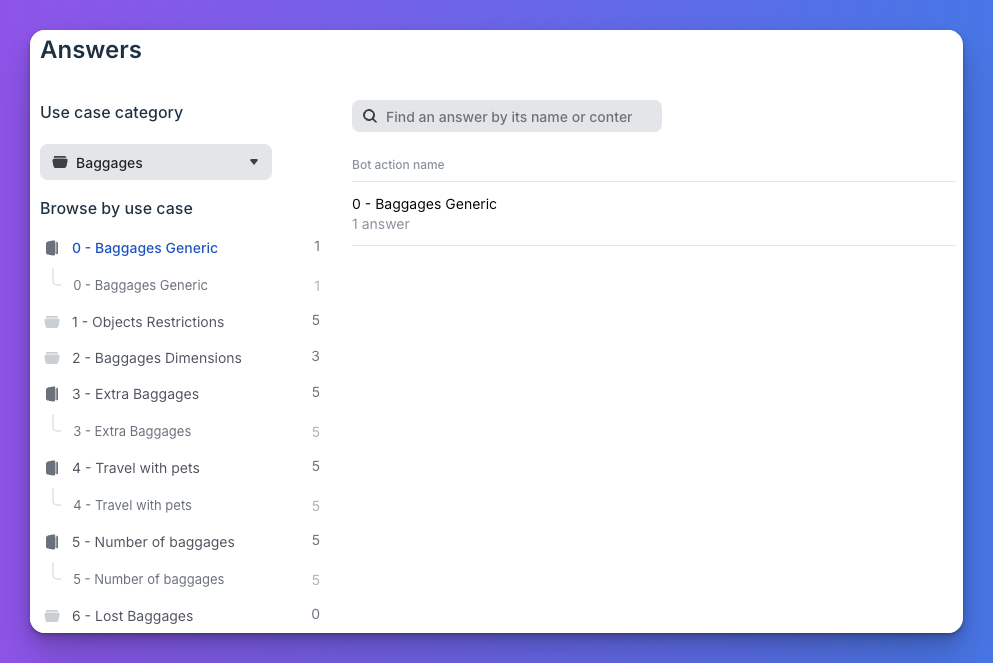 On the left-hand side of the Answers section, you’ll find a list of all the bot’s categories. A :Category acts as a folder that groups related Use Cases. Each category and use case displays the number of associated bot answers.