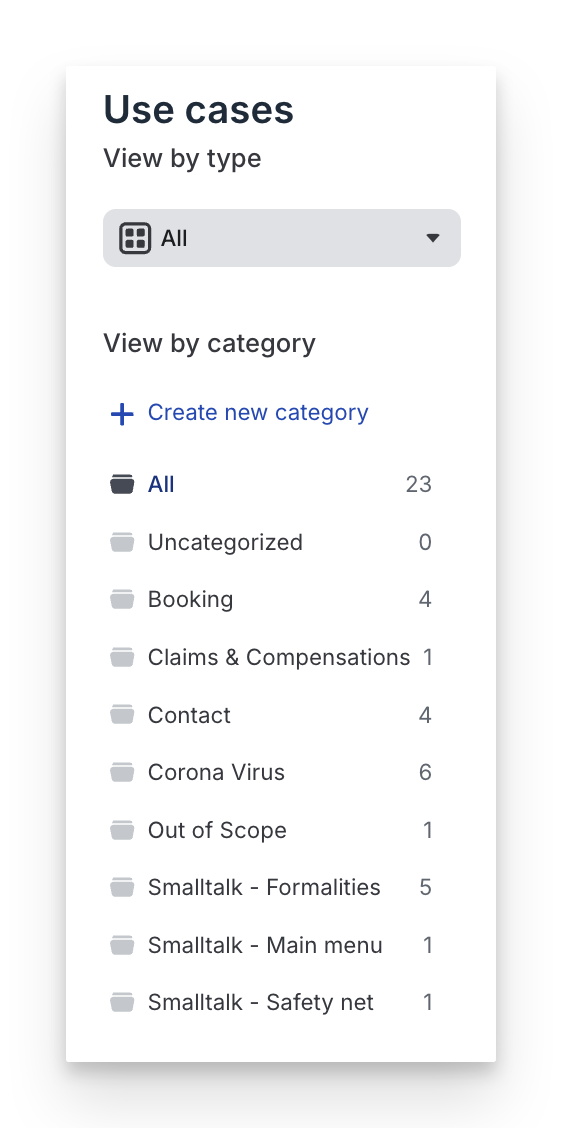 A category is like a folder — it helps you group related use cases under a common topic. This keeps your workspace organized and makes it easier to find what you need.