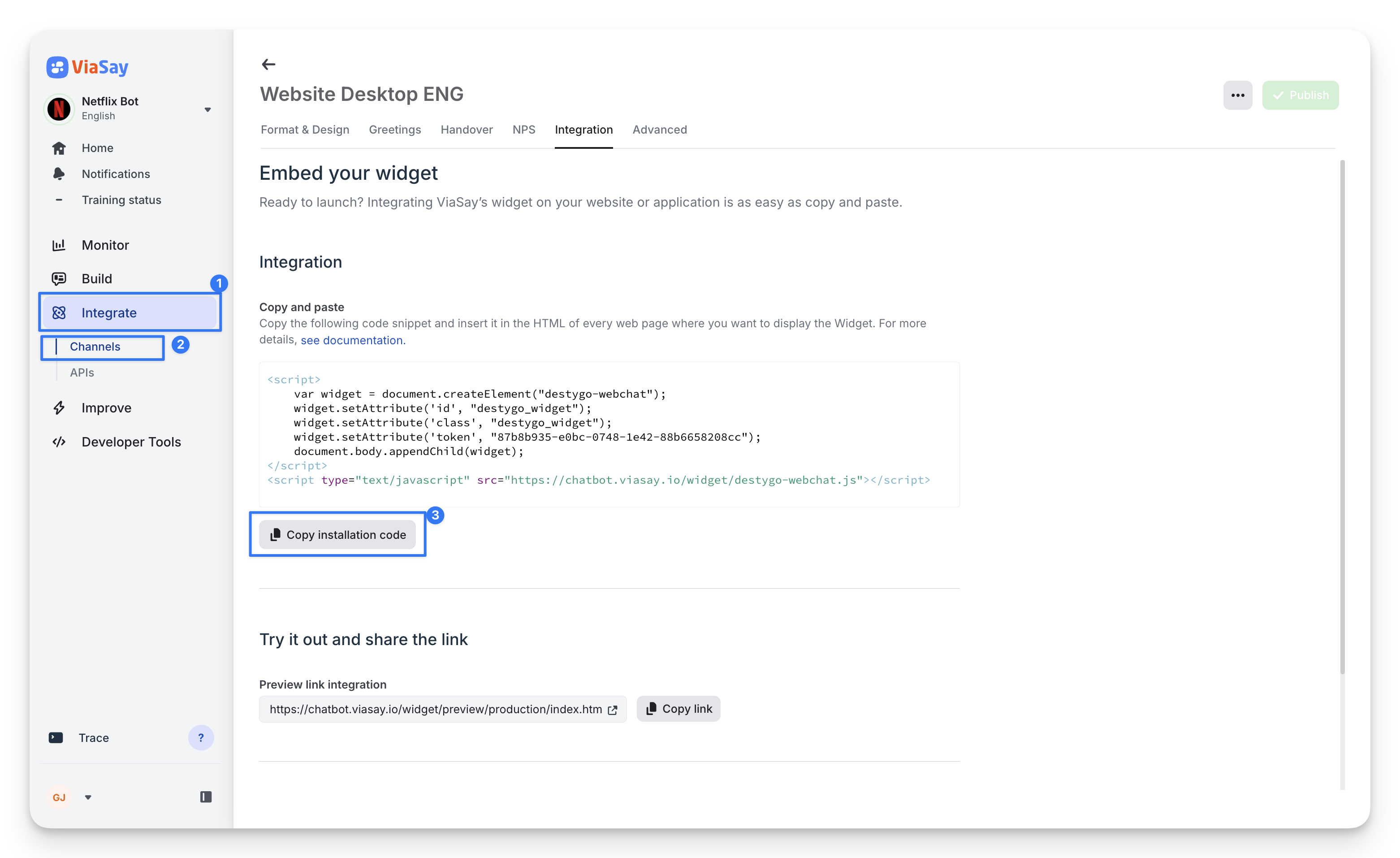 Navigate to Build > Integrate > Channels in your ViaSay dashboard. Copy the installation code snippet provided.