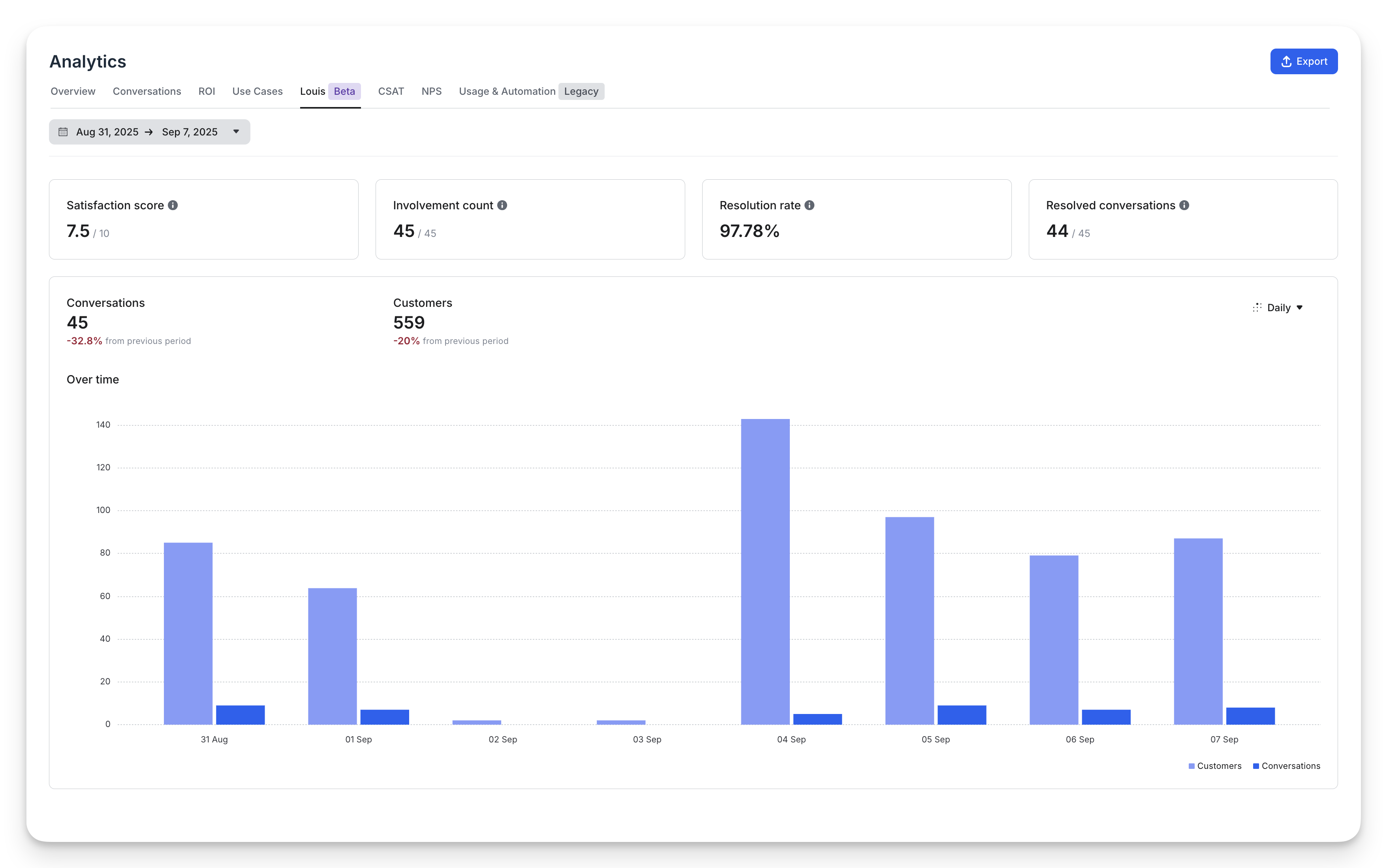- Louis AI Resolution Rate: Percentage of conversations resolved by Louis.