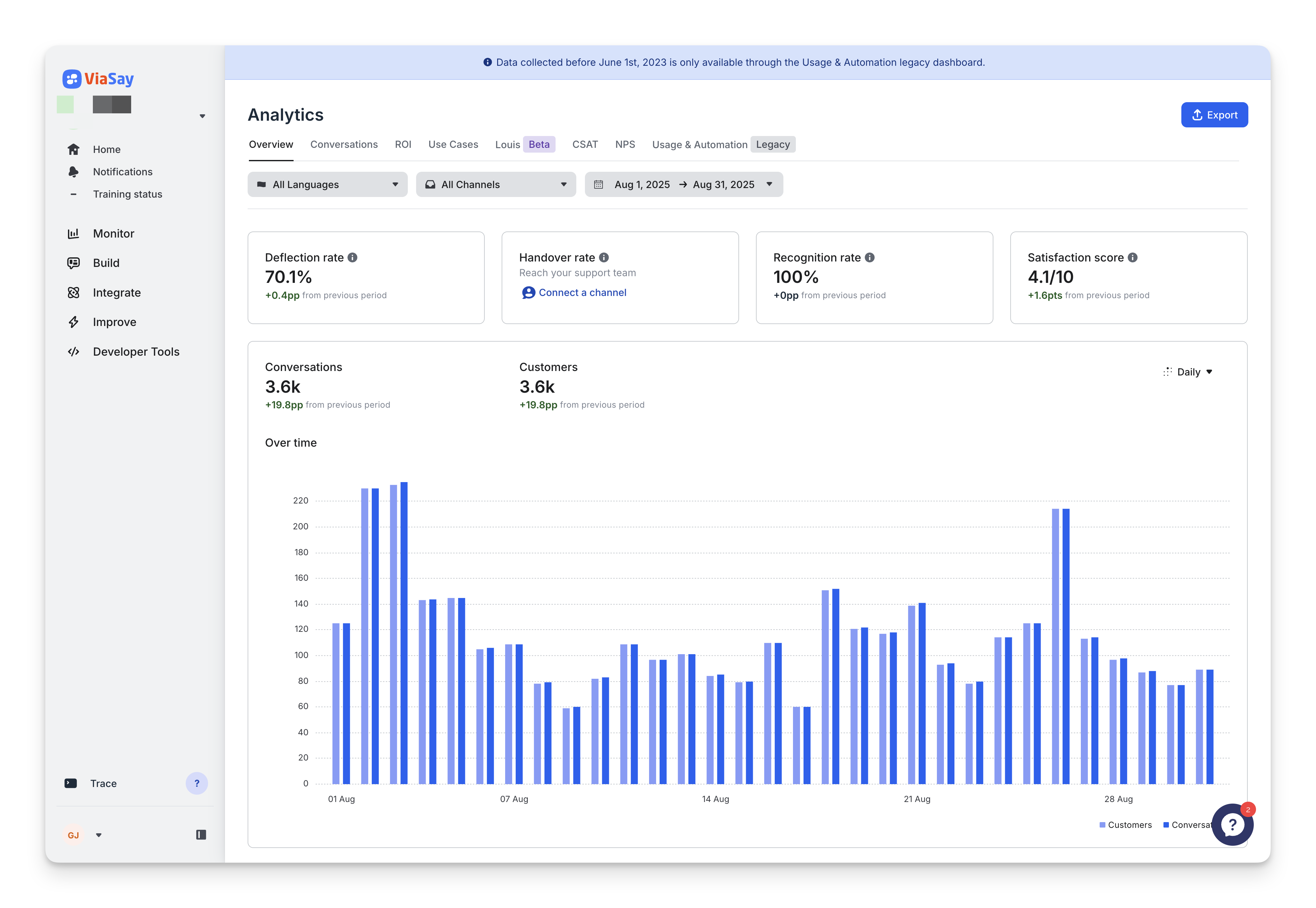 Track key performance metrics like deflection, handover, recognition, and satisfaction — all in one central dashboard