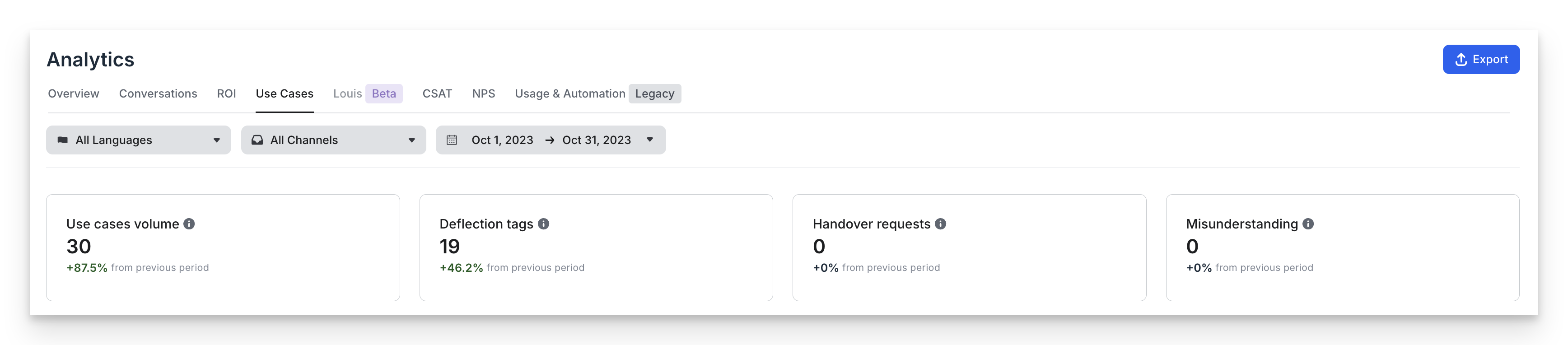 Example: A conversation triggers 6 use cases (1 of them twice) → we count 5 unique triggers. - Deflection Tags