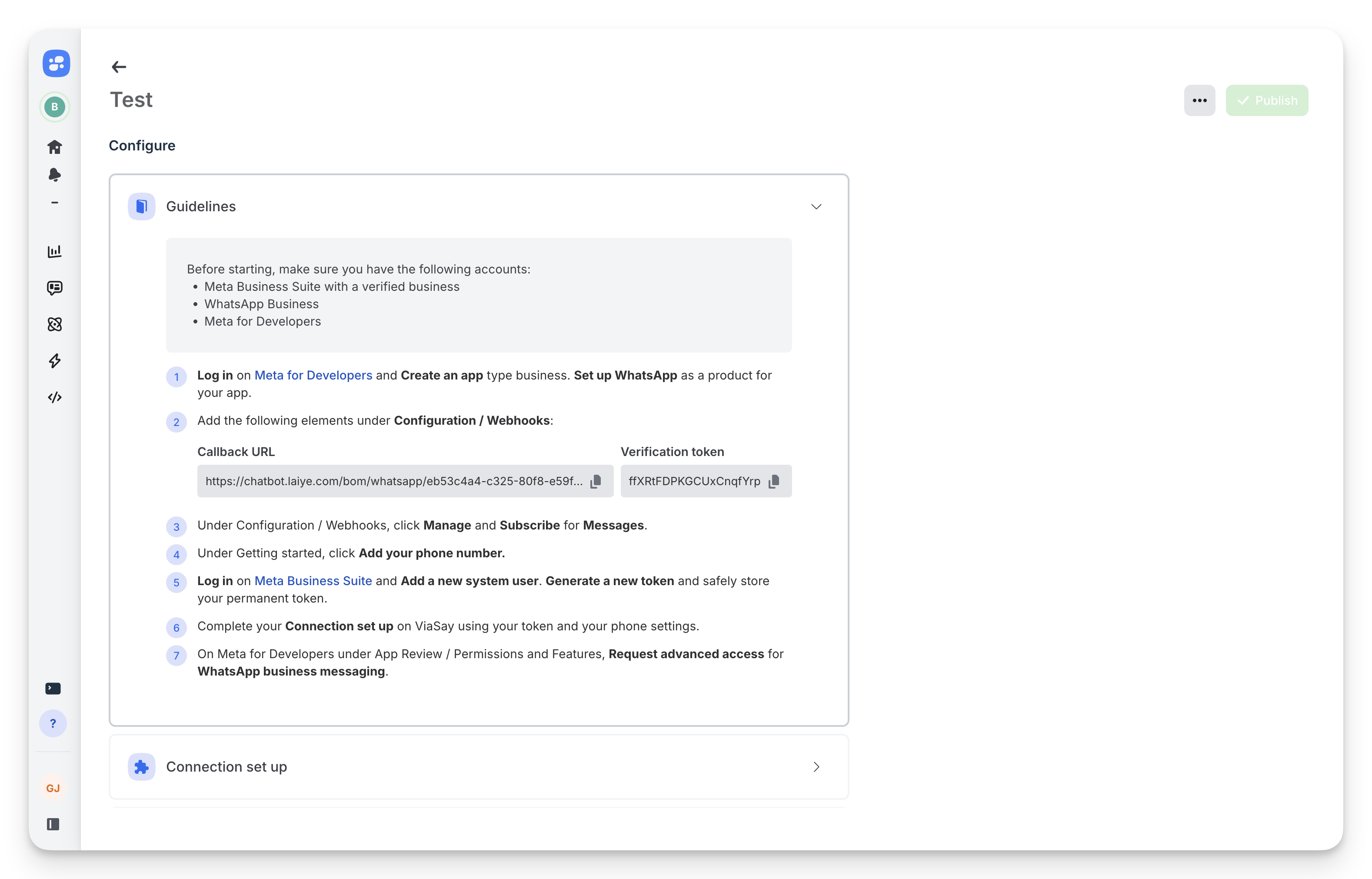 The "Connection test" ensures ViaSay can send messages to users via WhatsApp, but it does not confirm that ViaSay is receiving messages from users. If the bot is not responding correctly, check the steps related to the Webhook configuration.