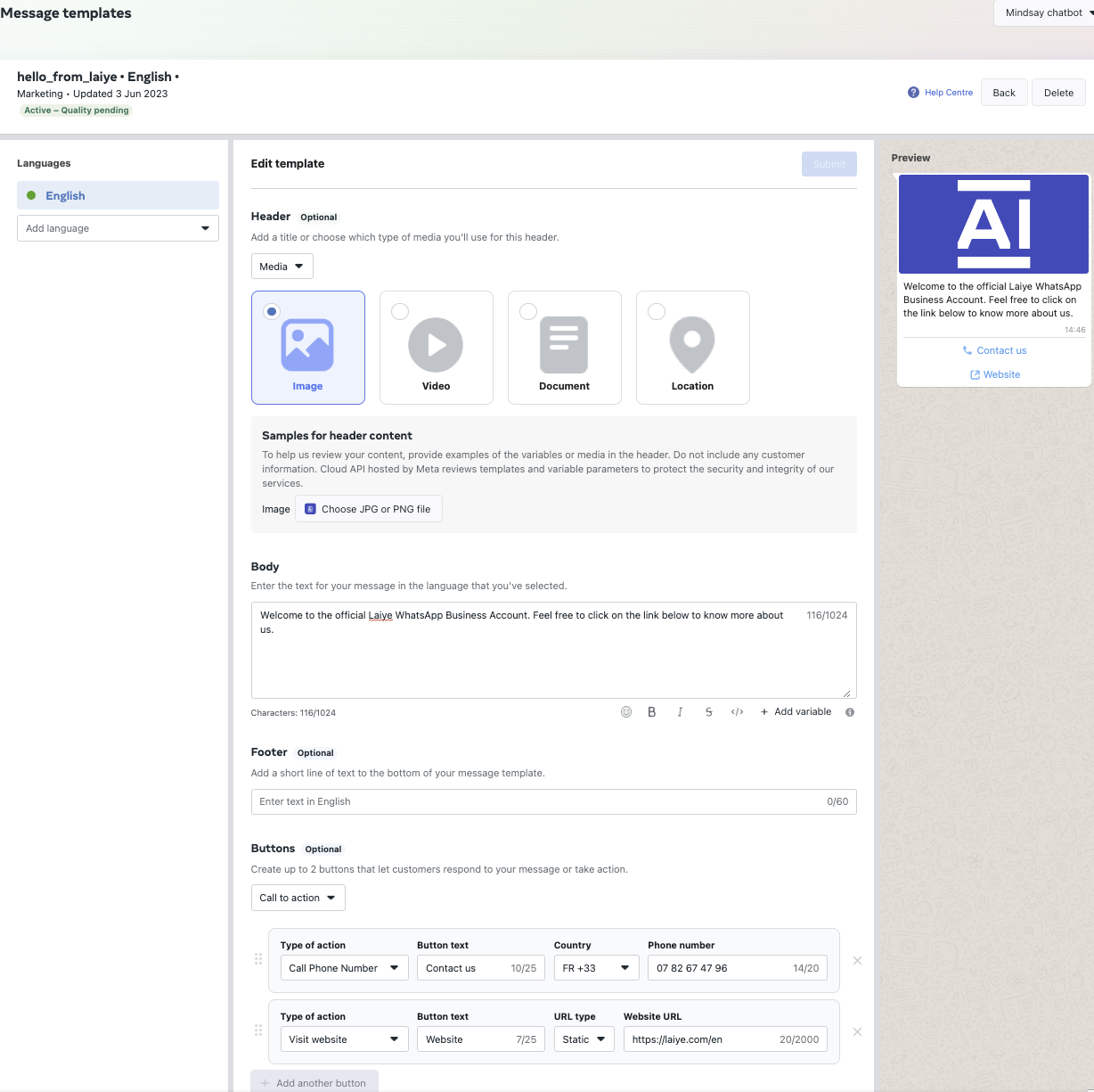 We want to send this template to 50 users. Whenever the users respond to the message, they will immediately start interacting with the Laiye Chat Bot and the bot will respond according to it's training and set up use cases.